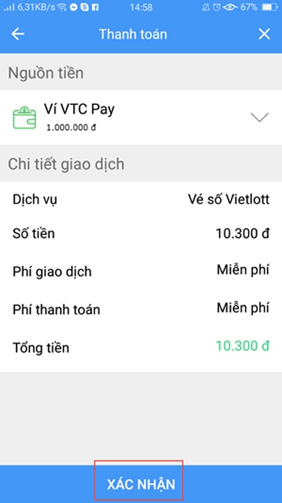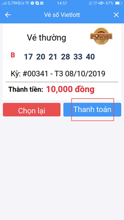 Bước 6: Kiểm tra lại toàn bộ thông tin gồm: Mã vé, loại giải thưởng, ngày quay, tổng giải,… và bấm thanh toán.