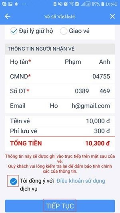 Bước 5: Chọn nút “tiếp tục”, kiểm tra thật kỹ lại các thông tin cá nhân và bấm nút xác nhận thanh toán là thành công.