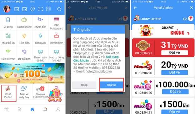 Bước 1: Tải ứng dụng VTC Pay, sau đó mở lên và chọn “vé số Vietlott” => “Tiếp tục”