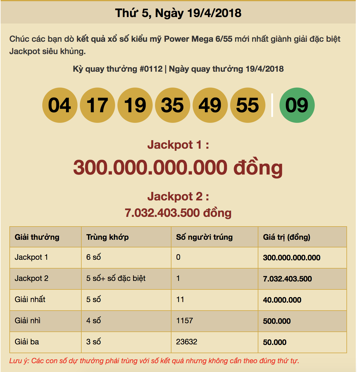Thêm 1 người trúng Jackpot 2 xổ số Power 6/55, kỳ quay số mở thưởng thứ #0112 ngày 19/4/2018 với tổng giá trị giải thưởng 7.032.403.500 đồng. Riêng giải Jacpot 1 hơn 300 tỷ đồng vẫn chưa có khách hàng nào trúng giải từ khi bắt đầu mở thưởng xổ số Power 6/55.
