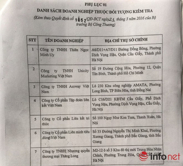 Các doanh nghiệp có tên trong danh sách kiểm tra gồm 7 công ty đa cấp sau: Công ty TNHH Thiên Ngọc Minh Uy, Công ty TNHH Unicity Maketing Việt Nam, Công ty TNHH Amway Việt Nam, Công ty Cổ phần Tập đoàn Liên kết Việt Nam, Công ty Cổ phần Liên kết Tri thức, Công ty Cổ phần Liên Minh tiêu dùng Việt Nam, Công ty TNHH Nhượng quyền Thăng Long.