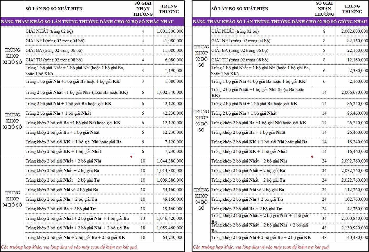 - Trường hợp hai bộ số của người chơi trùng nhiều hạng giải thưởng, người chơi được lãnh tất cả các giải thưởng đó.