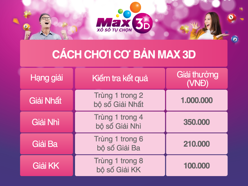 - Max 3D cơ bản: Chọn 1 bộ số có 3 chữ số từ 000 đến 999 để tham dự gia dự thưởng. VD: 123