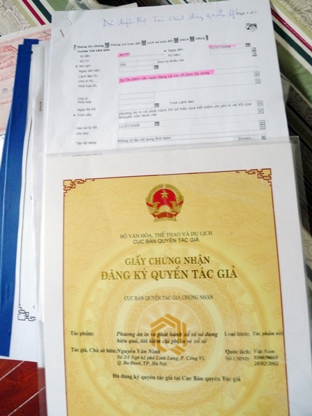 Trao đổi với PV ông Nguyễn Văn Ninh cho biết, tác phẩm “Phương án in và phát hành xổ số sử dụng hiệu quả, tiết kiệm chi phí in vé xổ số” do ông biên soạn đã được Cục Bản quyền tác giả cấp giấy chứng nhận số 1955/2008/QTG ngày 3/6/2008.