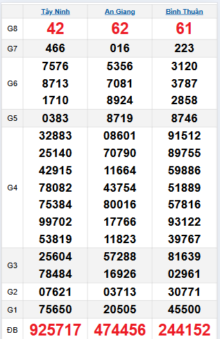 Thống kê giải tám An Giang: 91 - 18 - 62 - 01 - 32 - 95 - 51