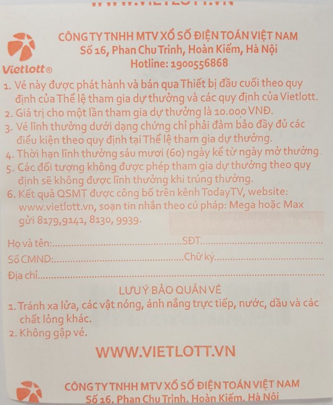 “Loại giấy in vé số của Vietlott là chất liệu giấy in nhiệt chuyên biệt, sử dụng công nghệ in bằng nhiệt (không phải in màu thông thường). Vì thế, để tránh rủi ro trong quá trình bảo quản vé, Vietlott khuyến cáo khách hàng để vé tránh xa môi trường có nhiệt độ cao và cần đọc kỹ hướng dẫn ở mặt sau tờ vé”, đại diện giải thích thêm.