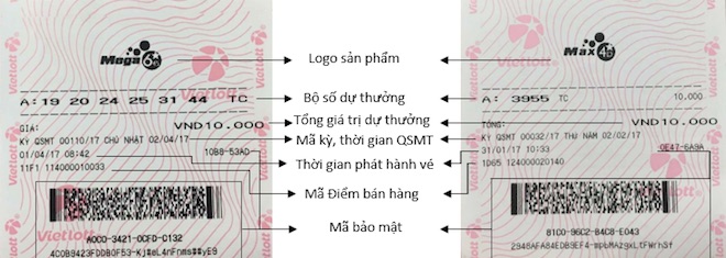 Đặc biệt, ở mặt trước mỗi tấm vé còn có mã bảo mật mà khi đưa vào máy checkwin (máy kiểm tra trúng thưởng) sẽ cho khách hàng biết là vé thật hay giả, trúng thưởng hay không trúng thưởng, các chữ và hình ảnh rõ nét. Trong khi đó, ở mặt sau có thông tin về Công ty Xổ số điện toán Việt Nam – Vietlott, phần hướng dẫn khách hàng và khu vực điền thông tin cá nhân của khách hàng trúng thưởng.