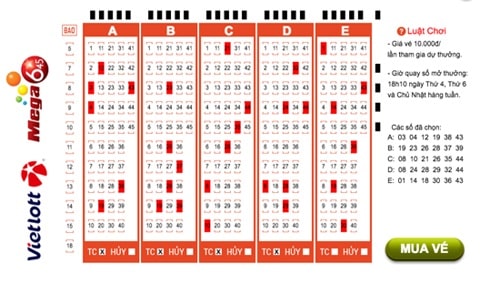 Bạn có thể chọn tối đa 5 bộ số, mỗi bộ gồm 6 cặp số với giá 10,000 VNĐ/bộ số để tham gia dự thưởng. Tức nếu bạn chọn cả 5 bộ số thì tờ vé số Vietlott Mega 6/45 đó sẽ có giá 50,000 VNĐ.