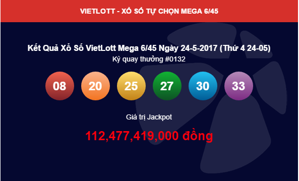 Cụ thể, tối ngày 24/05/2017, dưới dự giám sát của Hội đồng Giám sát xổ số với các đại diện đến từ Bộ Tài chính, Bộ Công an và Bộ VHTT&DL, Công ty Xổ số điện toán Việt Nam (Vietlott) đã thực hiện quy trình QSMT kỳ thứ 132 sản phẩm xổ số tự chọn Mega 6/45. Hội đồng Giám sát xổ số đã xác nhận kết quả kỳ QSMT có bộ số: 08 – 20 – 25 – 27 – 30 – 33. Xác định từ hệ thống kinh doanh xổ số tự chọn số điện toán, Vietlott xác định có 1 vé trúng thưởng giải Jackpot với trị giá 112.477.419.000 đồng (chưa khấu trừ thuế thu nhập cá nhân theo quy định). Ghi nhận từ hệ thống cho thấy, khách hàng đã mua chiếc vé này với 1 bộ số tham gia dự thưởng trùng với kết quả Jackpot và chiếc vé này được phát hành sáng ngày 24/05/2017 tại điểm bán hàng xổ số tự chọn Vietlott: số 253 Kim Mã, Quận Ba Đình, Tp. Hà Nội thuộc đại lý Mai Hoàng Ngân. Đây là lần thứ 4, vé trúng Jackpot được phát hành tại Thủ đô.