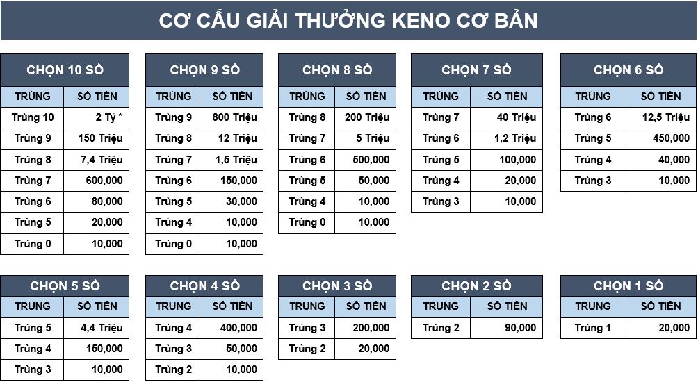 Keno có 80 con số trong tập hợp số từ 1 đến 80. Chỉ với 10.000đ bạn có thể lựa chọn từ 1 đến 10 con số với cơ cấu giải thưởng như sau: