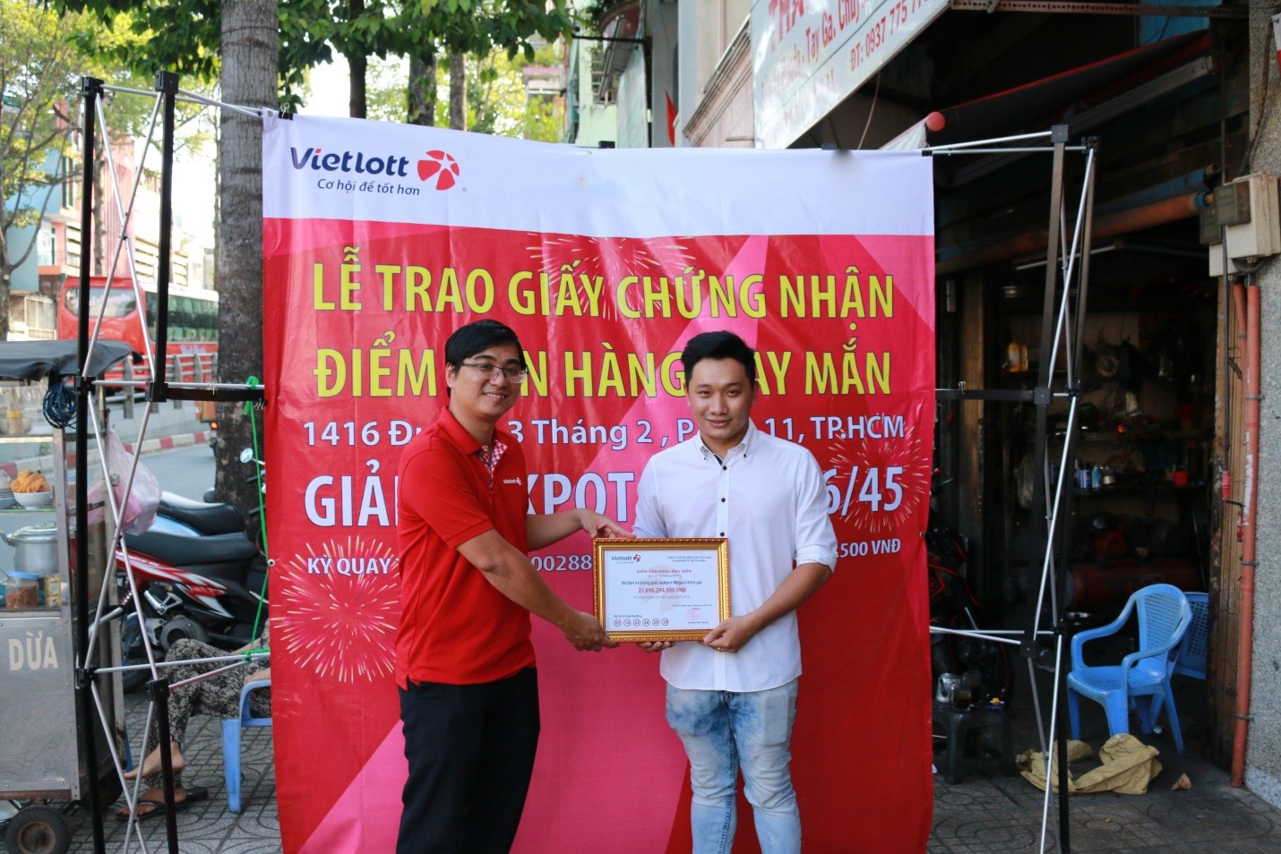 Chi nhánh Tp. Hồ Chí Minh đã tiếp nhận chiếc vé xổ số tự chọn Mega 6/45 (ảnh đính kèm) từ ông T.R. Qua kiểm tra trên hệ thống kỹ thuật và hồ sơ kèm theo, Vietlott xác định chiếc vé hợp lệ và đã trúng giải Jackpot sản phẩm Mega 6/45 kỳ QSMT thứ 288. Tấm vé được phát hàng tại điểm bán hàng xổ số tự chọn Vietlott: số 1416 Đường 3/2, Phường 2, Quận 11, TP. Hồ Chí Minh (thuộc Đại lý Fortuna).