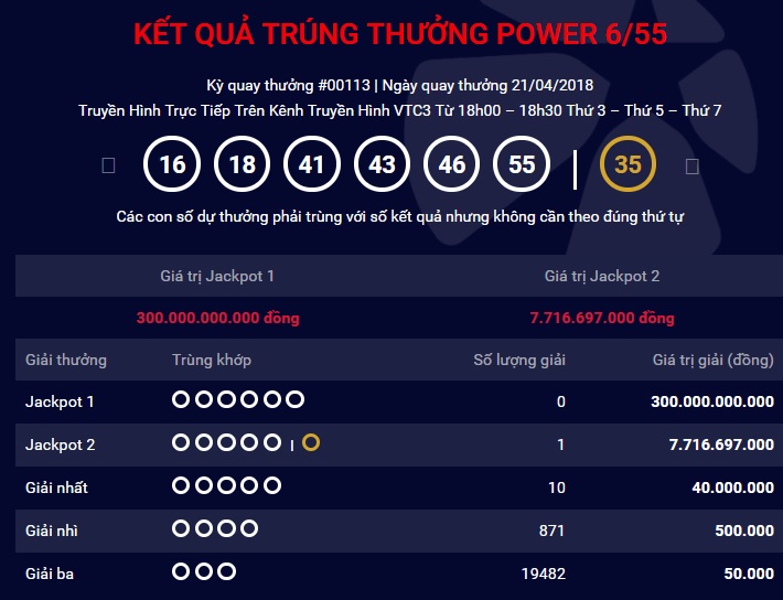Tối 21/4/2018, dưới sự giám sát của Hội đồng Giám sát xổ số với các đại diện đến từ Bộ Tài chính, Bộ Công an và Bộ VHTT&DL, Vietlott đã thực hiện quy trình QSMT thứ 113 sản phẩm Power 6/55. Toàn bộ quy trình QSMT được tường thuật trực tiếp trên kênh truyền hình VTC3 và Fanpage chính thức của Vietlott tại www.facebook.com/vietlott.vn nhằm tạo điều kiện để mọi người dân có thể theo dõi, giám sát. Hội đồng Giám sát xổ số xác nhận kết quả kỳ QSMT này có bộ số 16 – 18 – 41 – 43 – 46 – 55 và số đặc biệt là 35.