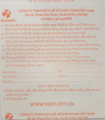 Ở mặt sau: Được in đầy đủ tên công ty phát hành, hướng dẫn cách dò vé, giá trị giải thưởng và khu vực điền thông tin cá nhân của khách hàng.