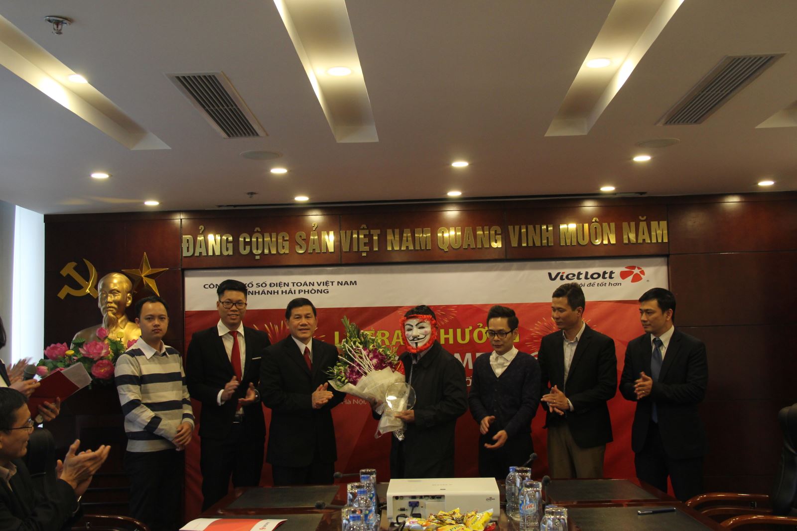 Ông Nguyến Tuấn Linh Phó Giám đốc phụ trách Chi nhánh Hải Phòng trao giải Jackpot cho ông Đ.T.P dưới sự chứng kiến của đại diện Bộ tài chính, Bộ Công an, Bộ VHTT&DL, Deloitte Việt Nam cùng một số phóng viên, nhà báo của các cơ quan thông tấn báo chí.